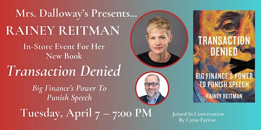 My new book, Transaction Denied: Big Finance’s Power to Punish Speech, is available for pre-order today.
